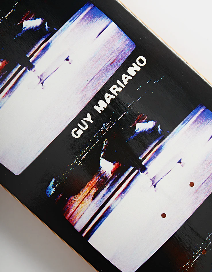 showcase their latest deck collection. The April Mariano 1990 Skateboard Deck is a pro model for skateboarding legend Guy Mariano, featuring a blurred photo of Guy skating by Chris Middlebrook repeated five times down the board. Embossed April branding and Guy's name sit on the lower half of the deck.